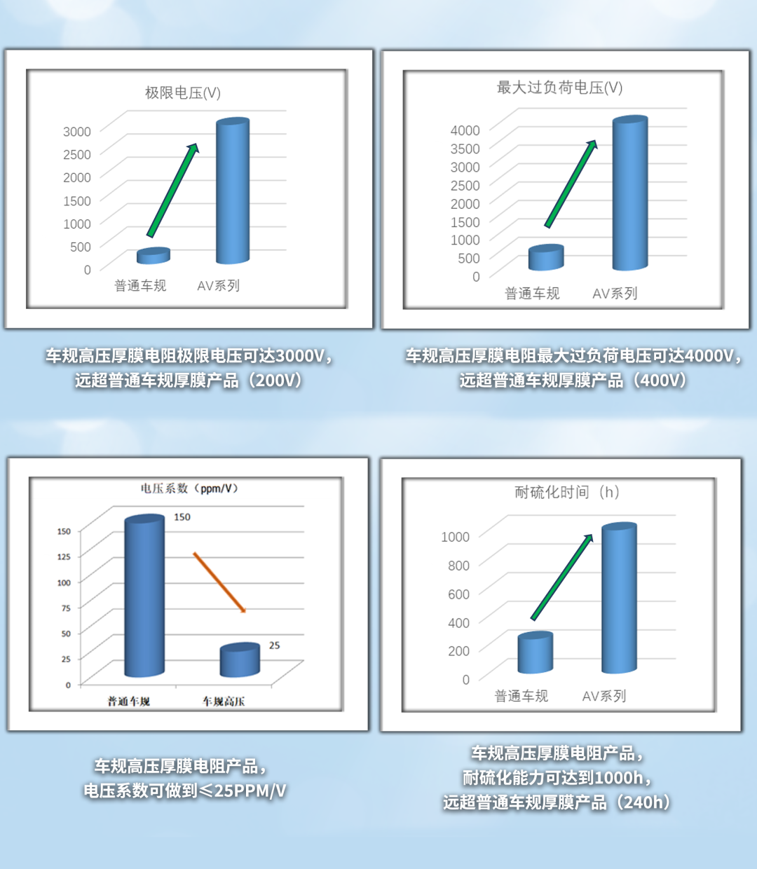 当车载动力系统、高压电源迈入 800V + 时代,普通车规电阻 200V 的耐压水平,早已难以应对瞬态高压与脉冲威胁 ——风华高科(000636)车规级 AV 系列高压厚膜电阻,正以硬核技术突破瓶颈,为电子系统筑牢 “高压安全盾”。