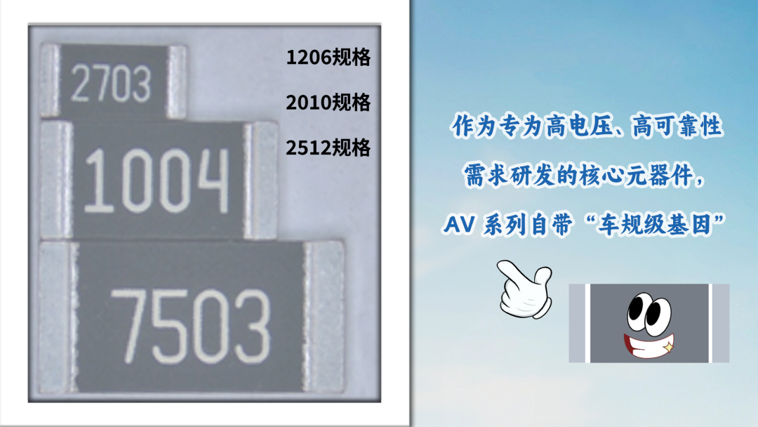 符合 RoHS 标准、无卤素的环保设计,让 AV 系列不仅 “能打” 更 “绿色”。它打破了高压采样的技术瓶颈,更凭借车规级品质,成为新能源、工控领域的 “首选电阻方案”—— 每一颗 AV 电阻,都是电子系统的 “高压安全防线”!