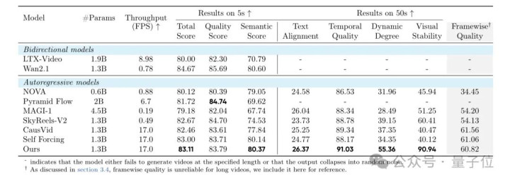 结果显示,Self-Forcing++在语义得分(80.37)和总得分(83.11)上均超过NOVA、SkyReels-V2、CausVid等模型,只略低于Wan2.1的总得分84.67。