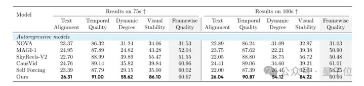 而在75秒到100秒生成中,文本对齐得分可达26.04、动态程度为54.12,相比CausVid分别提升6.67%和56.4%,相比Self-Forcing则提升18.36%和104.9%。